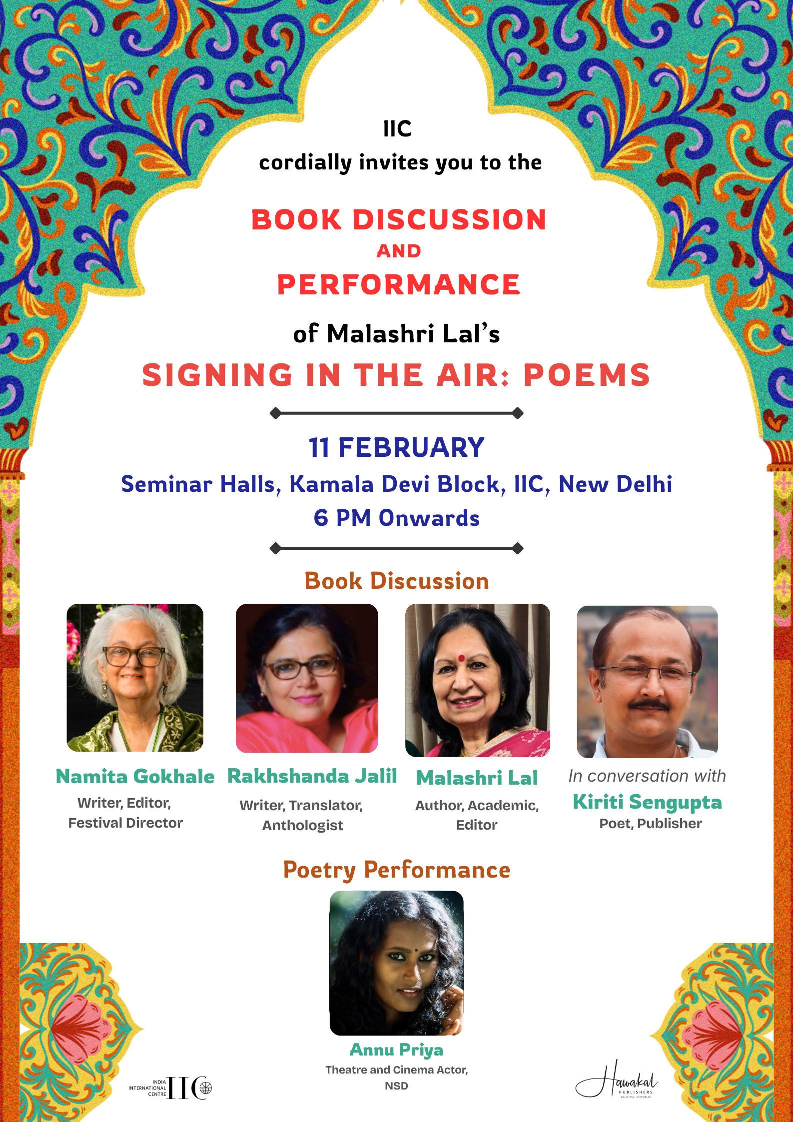 After introductory remarks by the host, the Chief Librarian of IIC, the book will be discussed by the eminent speakers Namita Gokhale—writer, editor, and Festival Director of the Jaipur Literature Festival—and Rakhshanda Jalil, writer, translator, and anthologist. The session will be moderated by poet and publisher Kiriti Sengupta (Hawakal Publishers). The evening will also present a theatrical interpretation of select poems from Signing in the Air by celebrated NSD actor and theatre artiste Annu Priya.